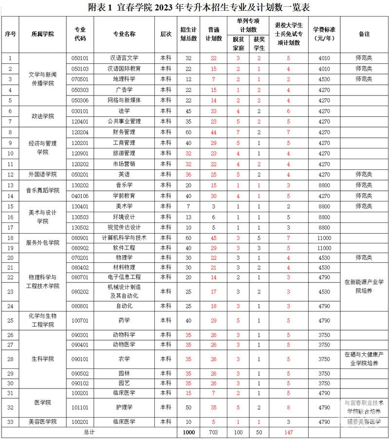 2023年我校专升本按“退役大学生士兵”免试计划、“其它专项计划”(含脱贫家庭<原建档立卡贫困家庭>、获奖学生<含高水平运动员>专项)和“普通计划”三大类进行招生。招生计划共1000人,具体详见附表1《宜春学院2023年专升本招生专业及计划数一览表》,实际招生专业及计划数以省教育厅公布为准。