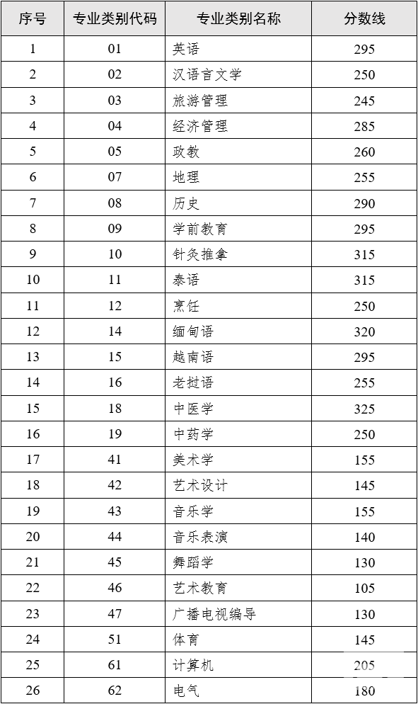 云南省2023年普通高等学校本科招收应届专科毕业生升学统一考试各专业类别最低录取控制分数线